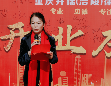 开业典礼上,涪陵区政协副主席、民建涪陵区委会主委陈圣玲发表了热情洋溢的致辞,对涪陵开锦分所盛大开业、重庆电视台社会与法公共服务涪陵中心、侨界法律援助服务站设立表示衷心的祝贺。同时提出三点希望:一是希望开锦分所依托总所,立足涪陵,围绕中心,勇担社会责任,努力打造律所特色,以优质高效、专业精准的服务赢得口碑,赢得市场。二是希望发挥“重庆电视台社会与法公共服务涪陵中心”、“侨界法律援助服务站”平台作用,有效推进律师公益服务与律师传统业务有机融合,为基层百姓、归侨侨眷和海外侨胞提供全方位、多层次、个性化的优质法律服务。三是开锦分所民主党派律师要全面贯彻新发展理念,积极融入和服务新发展格局,增强参政议政的主动性和实效性,为助力经济社会高质量发展贡献智慧和力量。