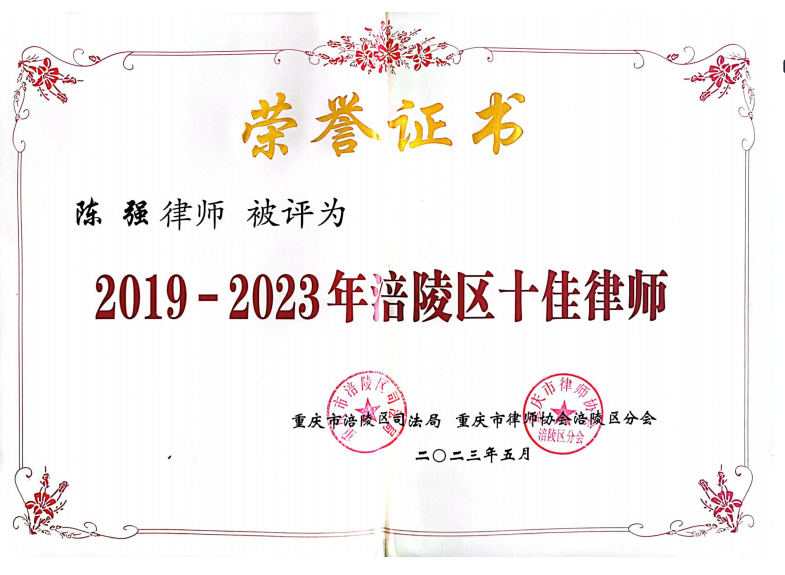 人物名片:陈强,专职律师,1998年7月首次执业。现任重庆博焕律师事务所主任、重庆市律师协会涪陵区分会副会长,以公司法务类、合同类、侵权类、房地产建筑类等相应的诉讼及非诉讼法律事务为主要执业领域。2023年5月,被区司法局、重庆市律师协会涪陵区分会评为2019-2023年涪陵区十佳律师。