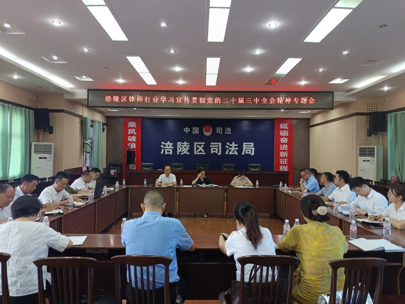 近日,涪陵区律师行业党委召开扩大会议,学习党的二十届三中全会精神,安排部署近期党建工作重点任务。区司法局副局长、区律师行业党委书记王琼主持会议并讲话,区律师行业党委委员参加会议,区律工委秘书处和各律师事务所支部书记列席会议。