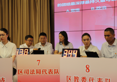 在紧张激烈的是“习声回响”抢答赛环节,区司法局代表队沉着冷静、互相鼓励,抢答迅速。各队比分和排名轮番更替。啦啦队掌声不断,给自己的代表队加油助威。比赛现场现场精彩纷呈气氛十分热烈。经过两个多小时的激烈比拼,最终区司法局代表队荣获三等奖。